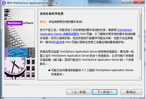 本步骤中如出现提示“警告:未检测到受支持的操作系统”不理他,可以安装的,可以查看IBM官网的说明:http://www-01.ibm.com/support/docview.wss?rs=180&uid=swg27006921