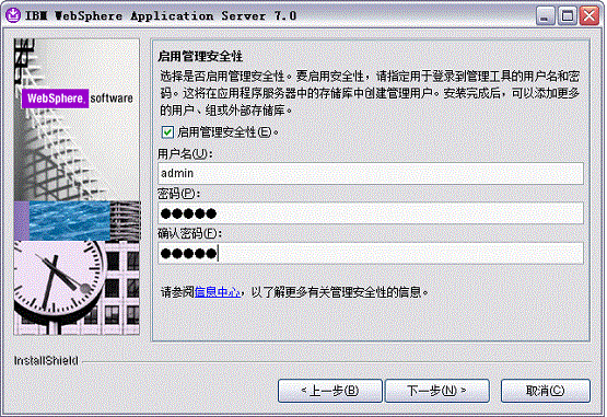 该用户名和密码用于登录控制台以及停止WebSphere服务。
