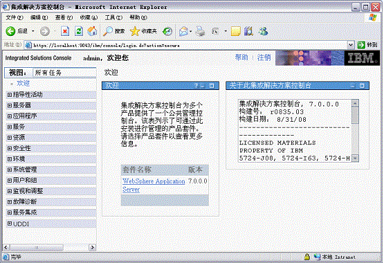 登录后可看到如下图所示控制台欢迎页面,主页的右边看到WebSphere版本号。