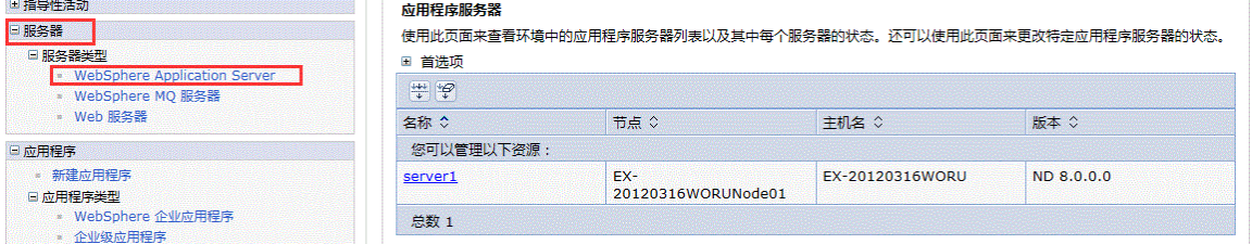 在控制台中单击服务器->WebSphere Application Server,如下图: